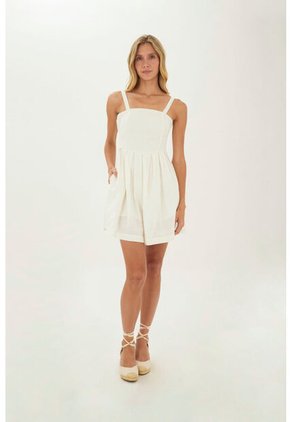 Vestido corto con escote recto y cargaderas graduable, con talle entallado que realza la silueta. Su diseño se complementa con una falda de tablas que aporta volumen y movimiento, mientras el cierre posterior garantiza un ajuste perfecto.La modelo usa un vestido talla S.